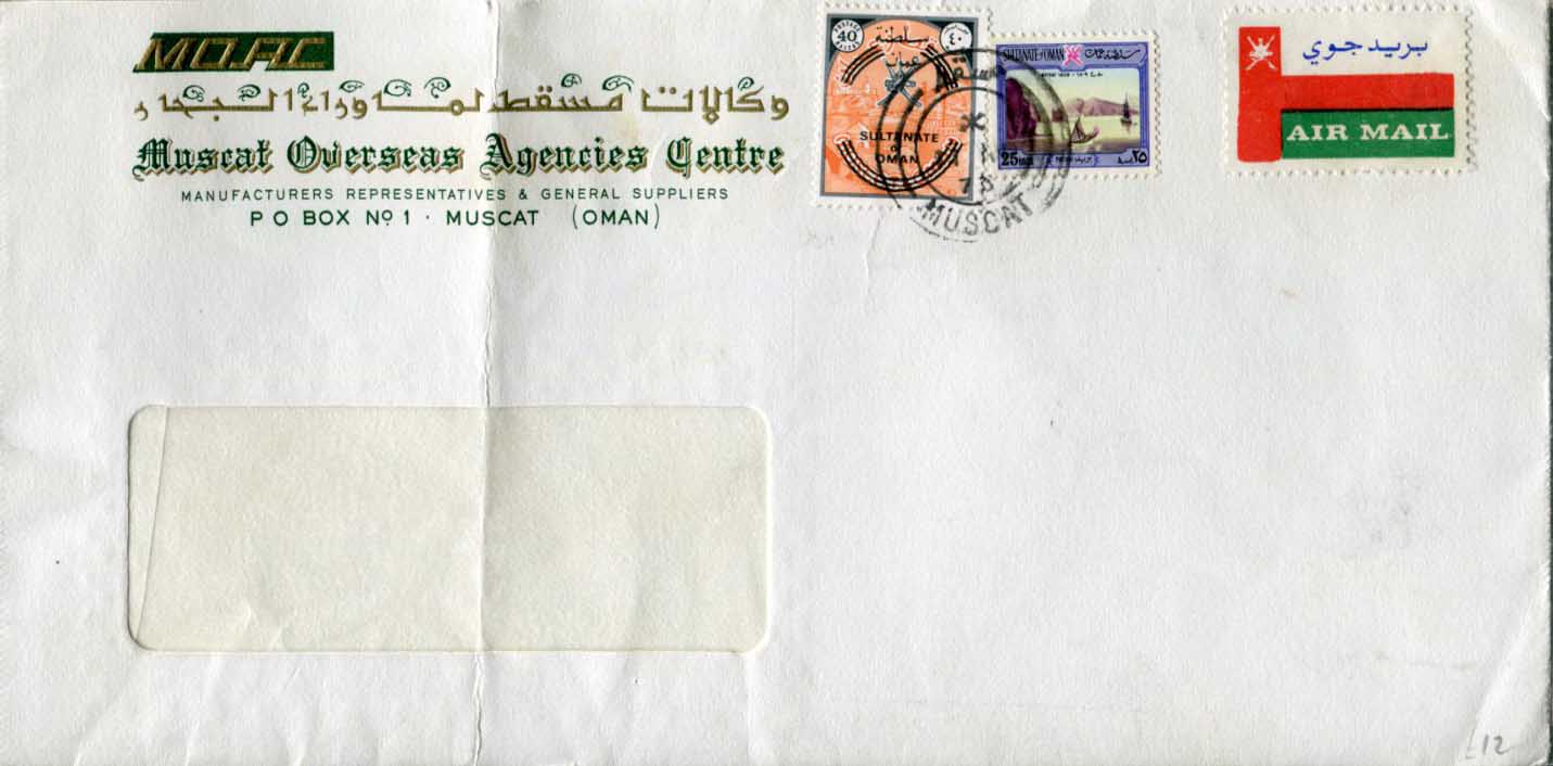 Oman: 1973 commercial window envelope franked with overprinted 40b Muscat & Oman and 25b pictorial stamps tied by MUSCAT bilingual datestamp. Sg. 127, 149