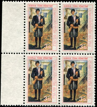Turkish Cyprus: 1973 (29 October). 50th Anniversary of Republic of Turkey 3m unmounted mint block of four with dot on rifle butt error. **
