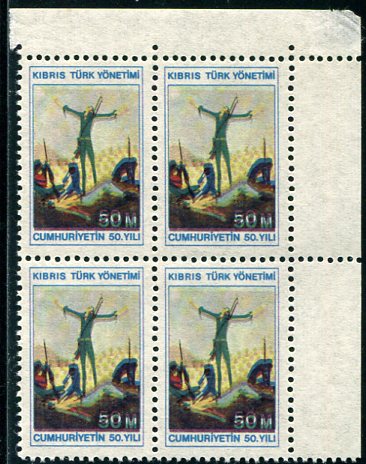 Turkish Cyprus: 1973 (29 October). 50th Anniversary of Republic of Turkey 50m unmounted mint block of four with shifted design variety. **