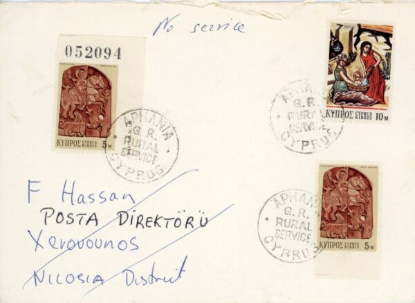 Turkish Cyprus: 1973 British Army cover from Aphania (now Gazikoy), Famagusta to Xerovounos (now Yukari Yesilirmak), Nicosia by Aphania GR Rural Service handstamps. Inscribed No Service in manuscript on front and returned to sender.