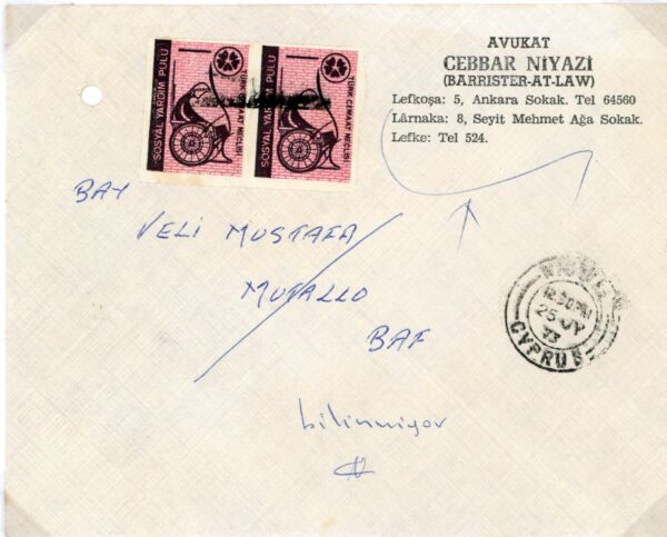 Turkish Cyprus: 1973 (25 July). ‘Advocate Djebbar Niazi’ imprinted cover from Nicosia to Baf (Paphos) franked with pair of 5m. Turkish Society Council Social Aid stamps struck by wavy line handstamp and Nicosia datestamp. Undelivered and return to sender endorsed bilinmiyor (unknown) and 27 July Nicosia cds. on reverse