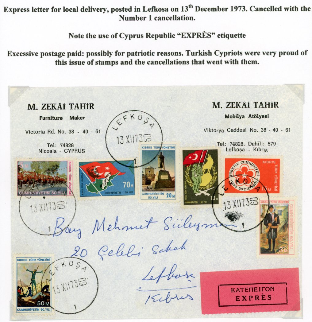 Turkish Cyprus: 1973 (13 December). “Furniture Maker” imprinted express philatelic cover franked with complete set of 50th Anniversary of Republic of Turkey tied by LEFKOSA datestamps.