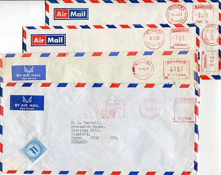 Bahrain: 1974-80 four covers to England struck by meter frankings, one with slogan cancel.