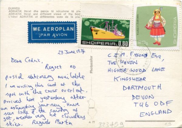 Albania: 1974 postcard of Durres to England franked with 20q costume and 80q ship stamps tied by dispatch cds.