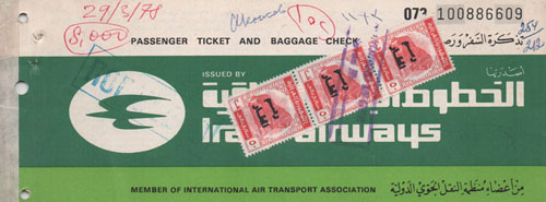 Iraq: 1980 Iraqi Airways Basra to Baghdad passenger ticket franked with strip of three 50f of 1969 Airport Departure overprinted tax stamps. Ross&Powell AP-5
