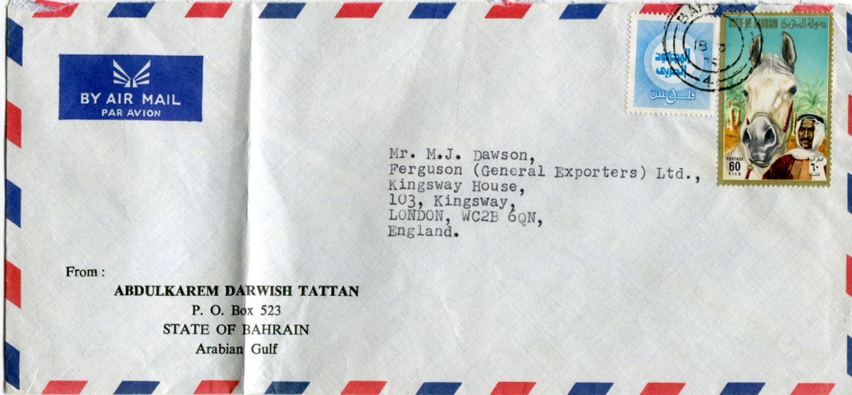 Bahrain: 1975 commercial long envelope to England franked with 60f horse and 5f War Effort obligatory tax stamps. Mi. 233, Sg. 223d