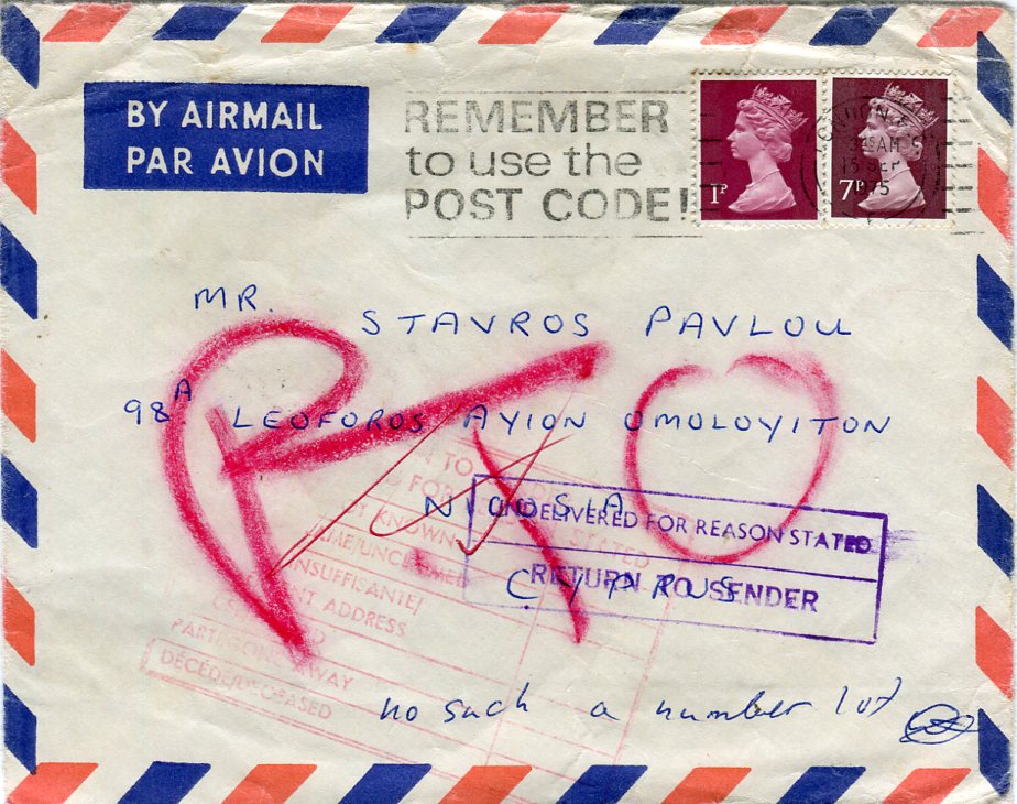 Cyprus: 1975 (15 September). Cover from London to Ayio Omoloyiton undelivered and return to sender with violet UNDELIVERED FOR REASON STATED / RETURN TO SENDER and red handcachets and marked Inconnu / Not Known as well as large P.T.O. manuscript by red crayon. Reverse 17 September arrival and 20 September dispatch Nicosia datestamps.