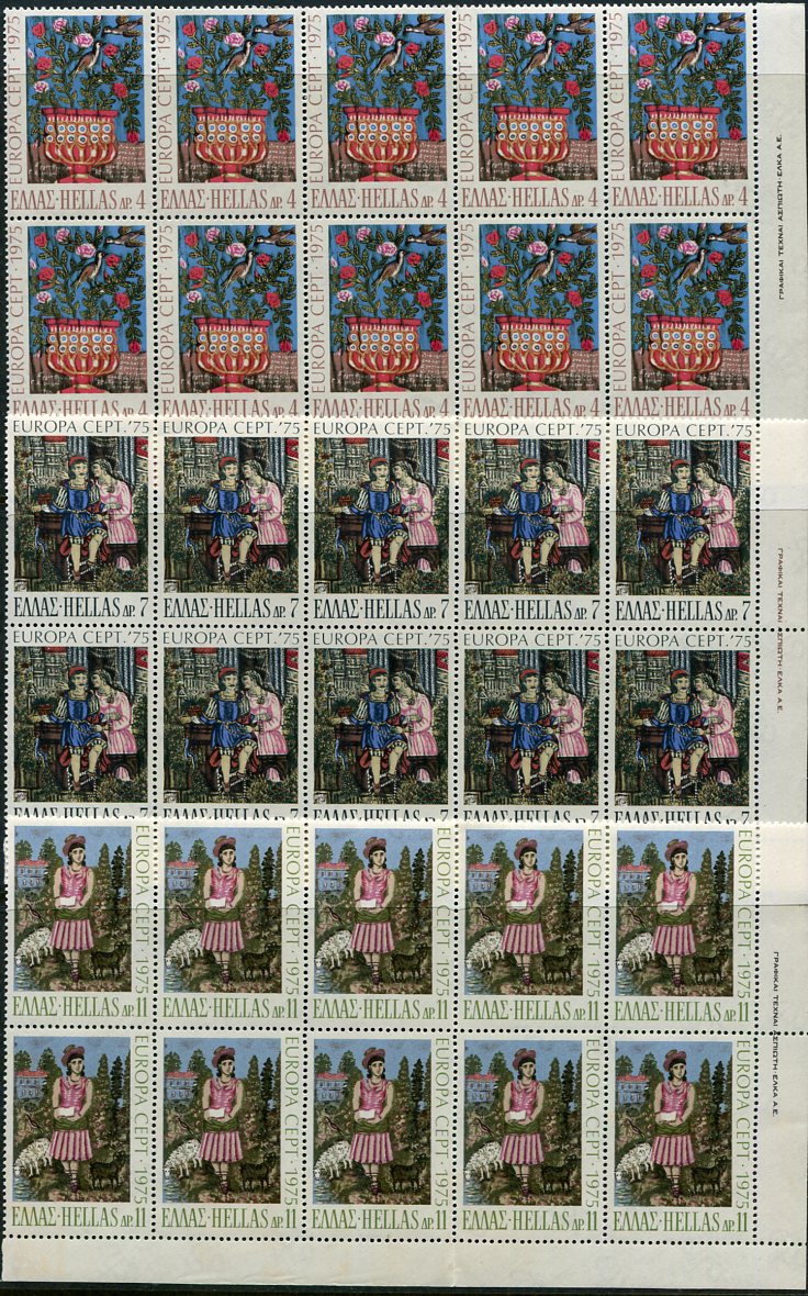 Greece: 1975 (10 May). Europa Cept Paintings unmounted mint marginal block of ten set. Hellas 1314/1316. **