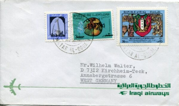Iraq: 1975 (31 March). Iraqi Airways imprinted cover to Germany franked with 25 definitive, 35f Military College and 10f surcharged on 3f tied by Al-Matar Al-Douali (Baghdad Airport) datestamp. Reverse no postal markings. Sg. 1102, 1157, 1172
