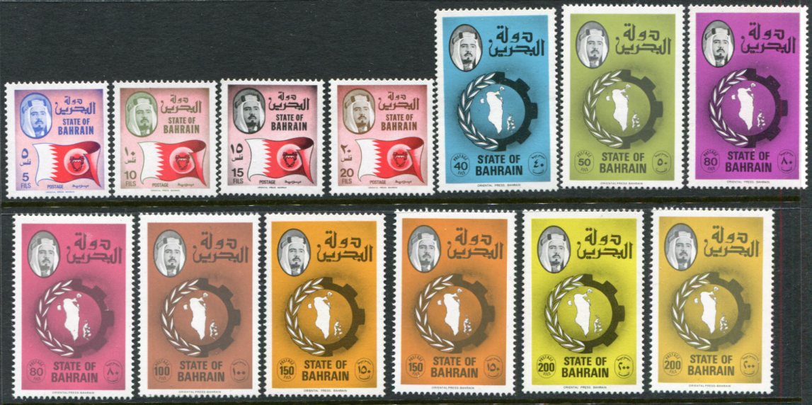 Bahrain: 1976 (4 January)-88. Shaikh Isa portrait flag and map definitive unmounted mint set including type II imprints of 80f, 150f and 200f. Mi. 240/247, 245II/247II – Sg. 224/231, 229a, 230a, 231a. **