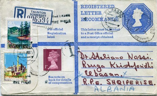Albania: 1976 (May). 42p Registered Stationery Cover with additional 1p from Taunton, Somerset to Albania, taxed and franked on arrival with 5q and 80q pictorial stamps for postage due tied by 23 August Elbasan datestamps, circular “T” and TAXE PERCUE cachets. Reverse 2 August Tirane-Etranger and 18 August Elbasan cds’s.