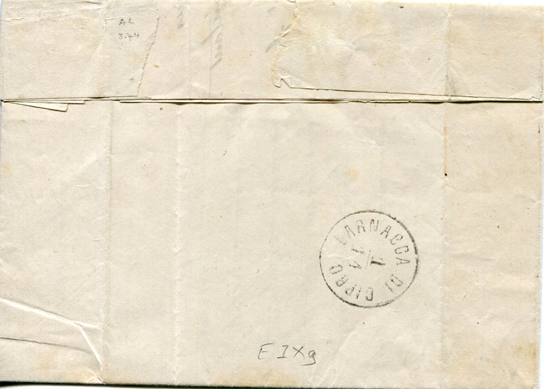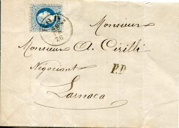 Austrian Levant: 1876 (29 December). Folded entire to Cyprus franked with 10sld coarse printing Franz Joseph portrait tied by RODI datestamp. Reverse LARNACA DI CIPRO arrival cds. Rare postal document between two islands.