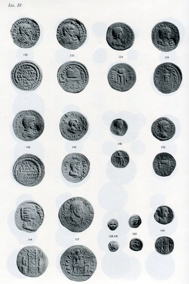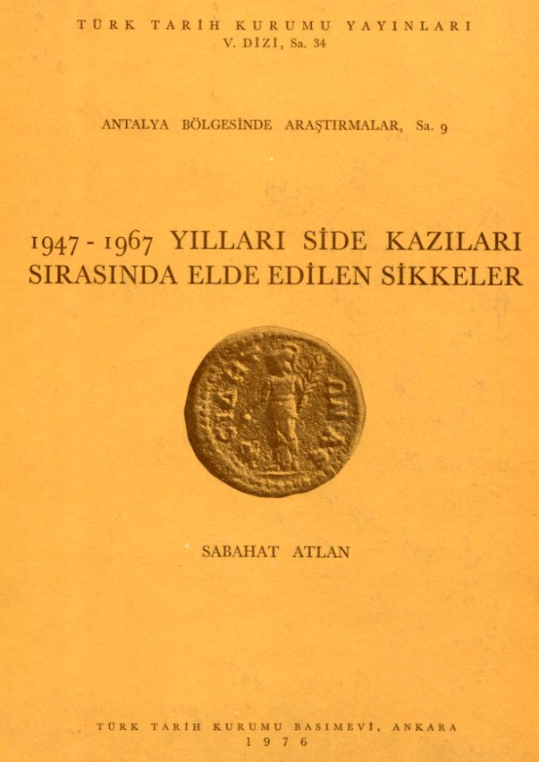 Turkey: Coins unearthed between 1947 and 1967 in Side (Antalya) excavations by Sabahat Atlan. Greek, Roman, Byzantium and Islamic coins published in 1976 by the Turkish Historic Institution #34, Turkish, 116 pages and 14 plates, hardcover, bumped corners but pages are very clean and unmarked. 242 x 325mm.