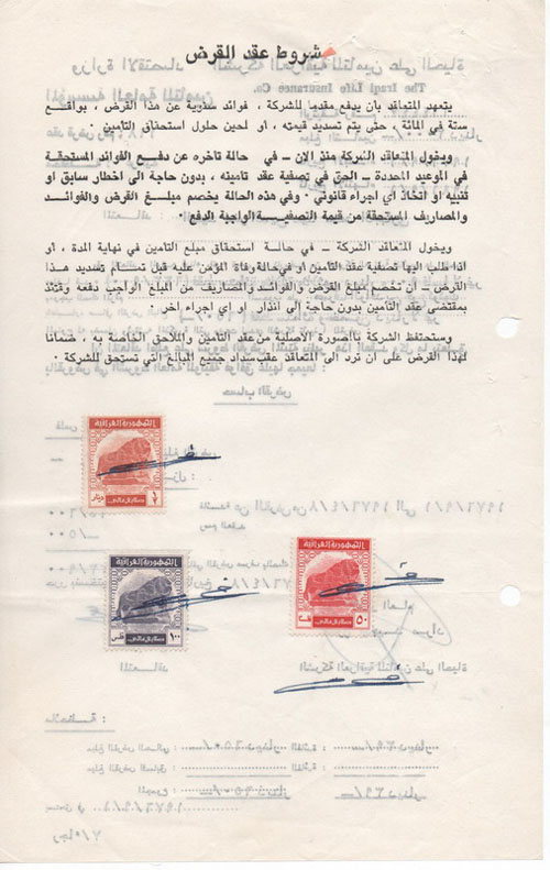 Iraq: 1976 Life Insurance document franked with 50f, 100f and 1/2d of Lion of Babylon of 1969 revenue stamps. Ross&Powell 322, 323, 325