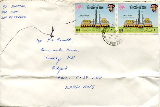 Oman: 1976 cover to England franked with pair of 100b Television Station stamps tied by Central datestamps. Reverse no postal markings. Mi. 167, Sg. 184