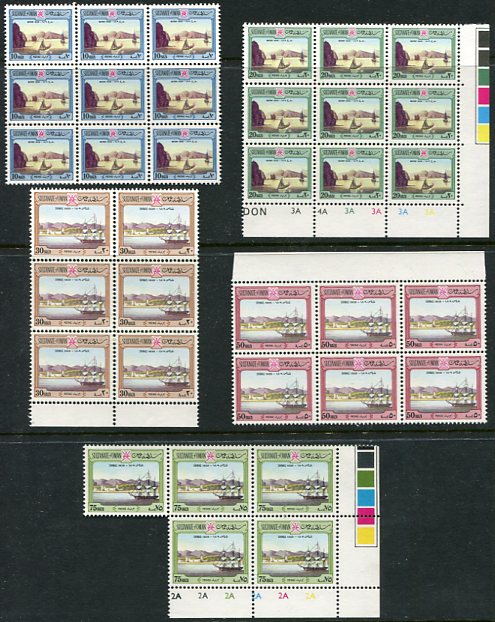Oman: 1976 (12 April) – 82). Major R. Temple paintings issue wmk Mult Crown CA Diagonal Sideways values 10b to 75b unmounted mint blocks of nine or six or five. Sg. 190, 193, 195/196