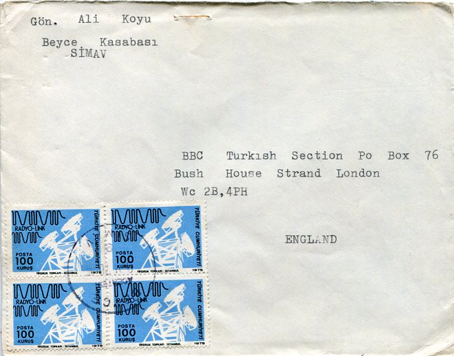 Turkey: 1976 cover to BBC franked with block of four 100k Telecommunication Radio Link commemorative stamp tied by Beyce – Simav Agency Post Office datestamp. Isfila 2742