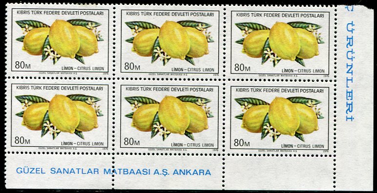 Turkish Cyprus: 1976 (28 June). Export Products 80m Lemon design unmounted mint block of six with orange halo plate flaw on first stamp. **