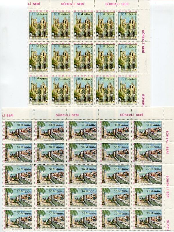 Turkish Cyprus: 1976 (29 April). Surcharged definitive stamps mint block of 25 set. **