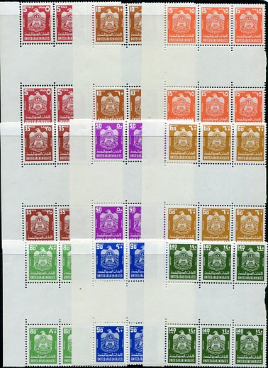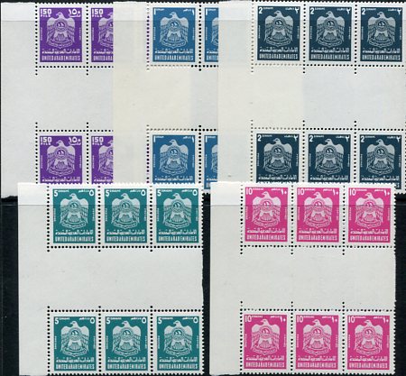 United Arab Emirates: 1976 (15 August). UAE Crest definitives unmounted mint gutter block of 6 set. Mi. 57/70, Sg. 57/70