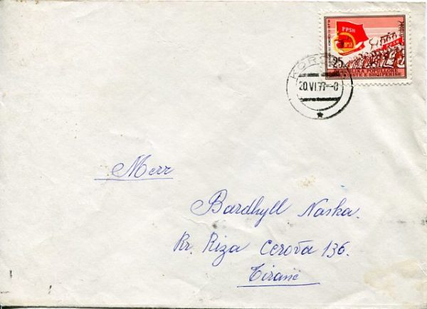 Albania: 1977 (20 June). Cover used inland franked with 25q Labour Union Congress tied by Korce datestamp. Reverse next day arrival cds. Sc. 1797
