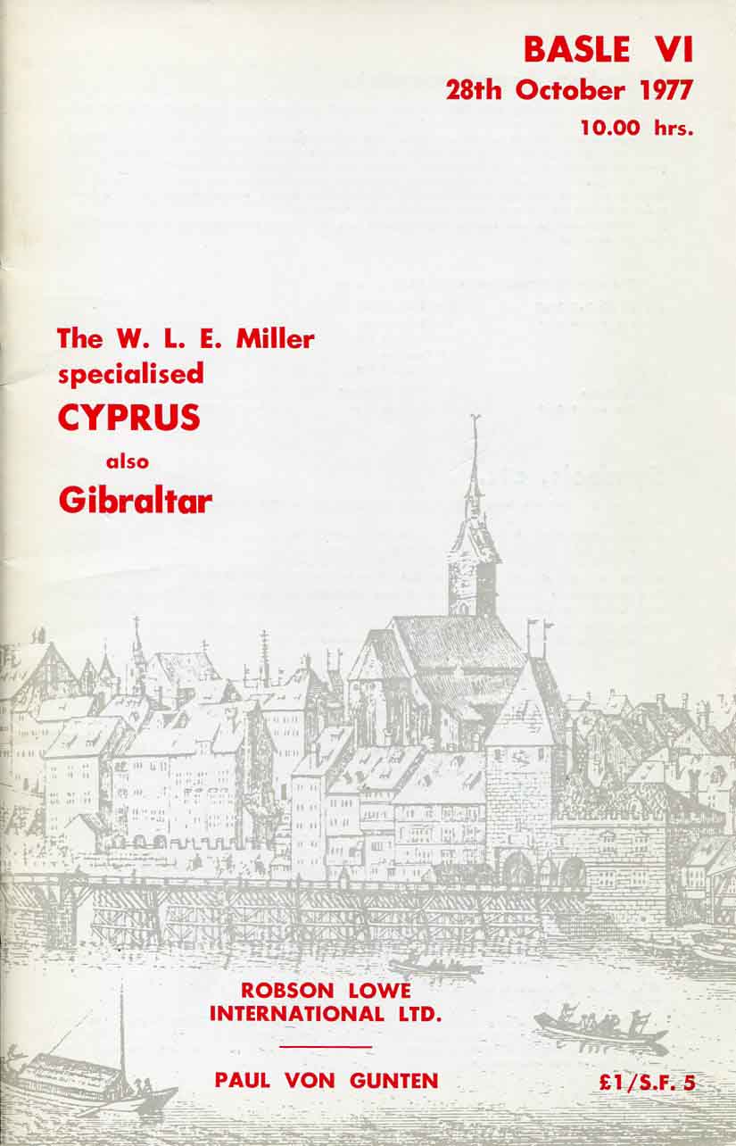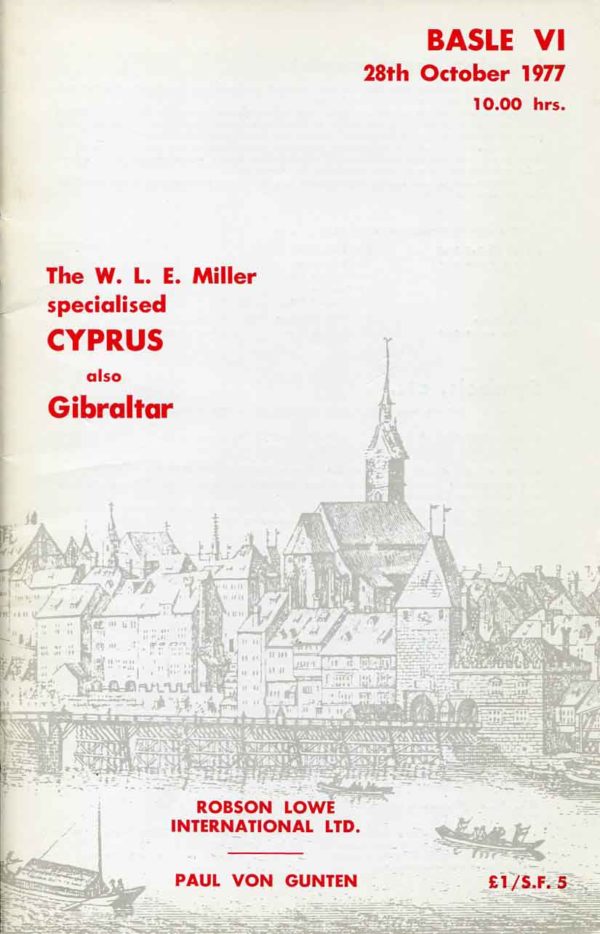 Cyprus: 1977 (28 October). Robson Lowe auction catalogue of The W. L. E. Miller specialised Cyprus, 267 lots with prices realised, b&w images. Very fine.