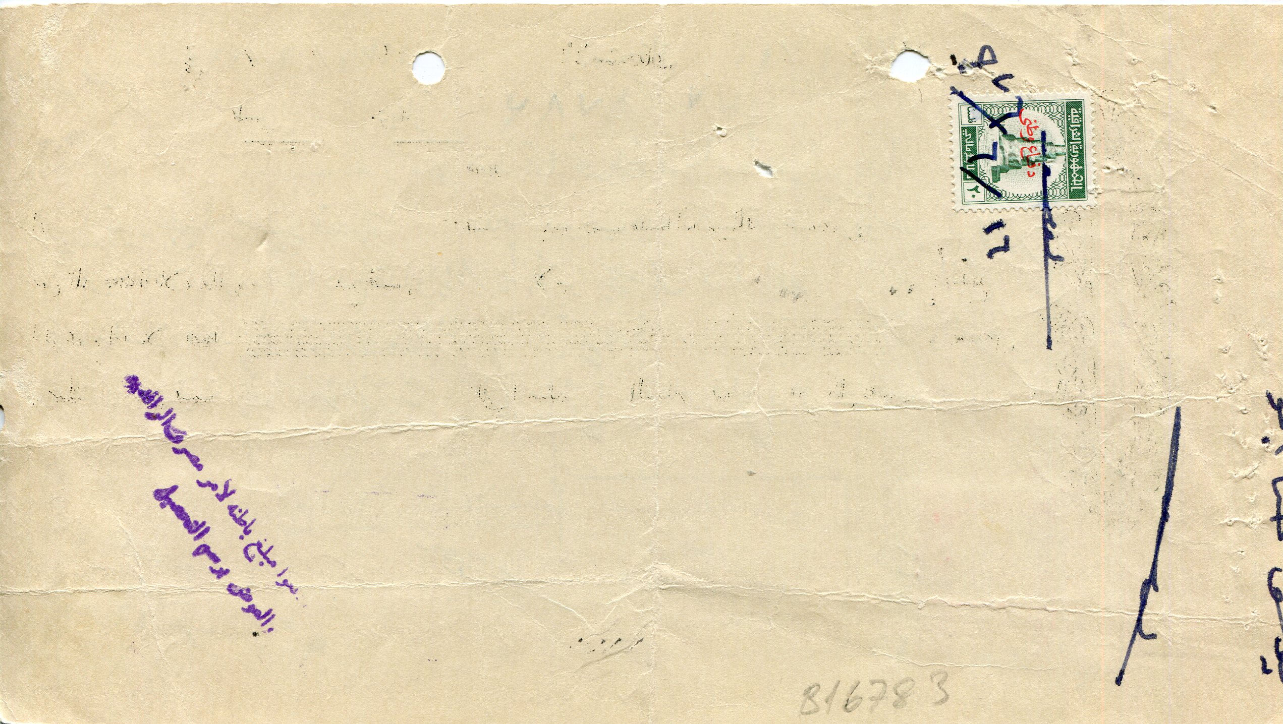 Iraq: 1977 document franked with two 50f Lions of Babylon of 1969, 30f Tower of Samarra of 1972, 20f National Defence overprinted and 50f Lawyer Association Fund of 1977 revenue stamps. Ross&Powell L-4/5b, CD-5, 322, 330