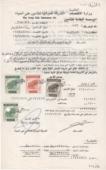 Iraq: 1977 Life Insurance document franked with 200f, 1/2d and two 1d of Lion of Babylon of 1969 revenue stamps. Ross&Powell 324, 325, 326