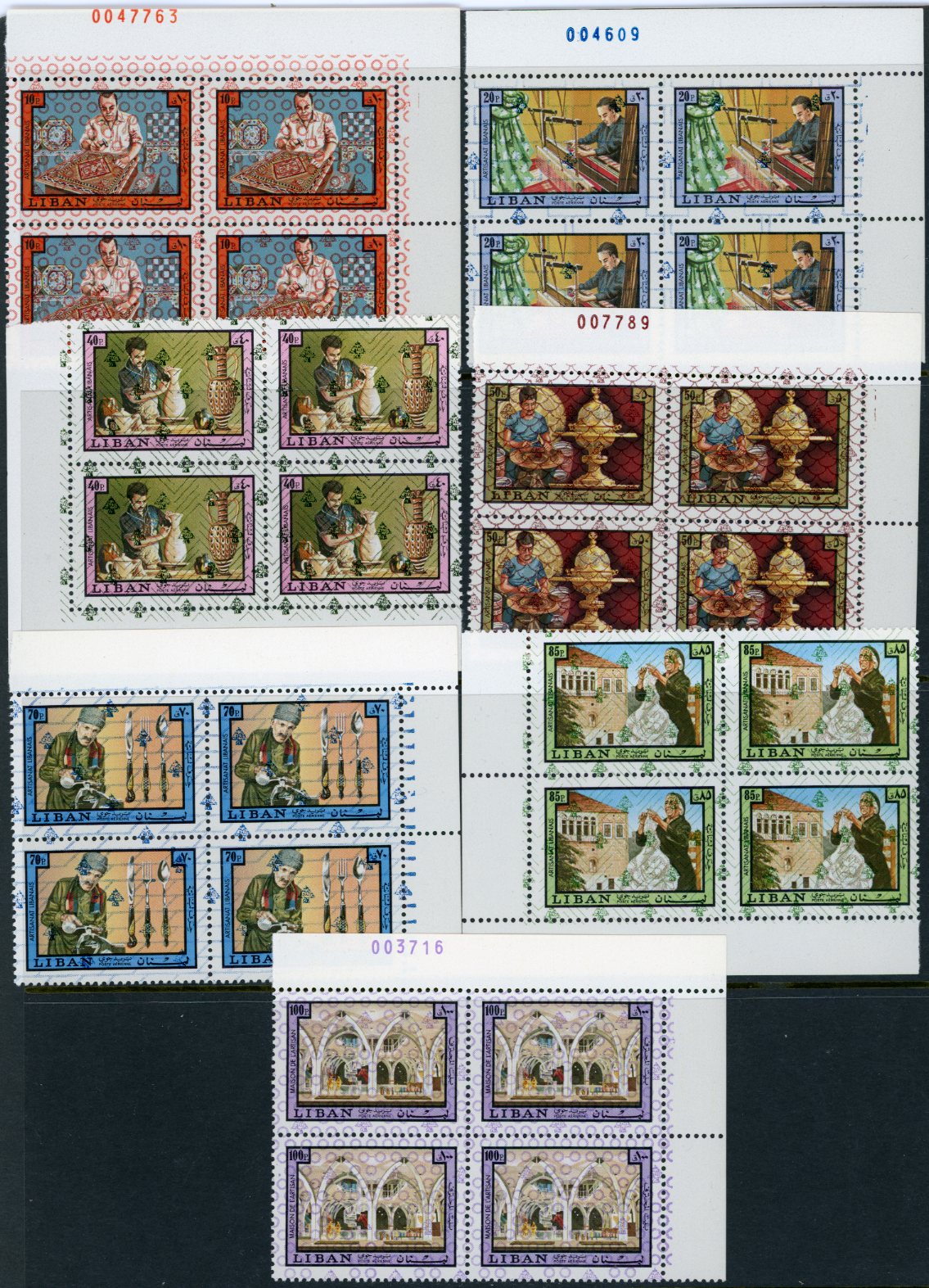 Lebanon: 1978 security overprinted on Lebanese Handicrafts stamps of 1973 unmounted mint corner marginal block of four set. During the civil war so many stamps were looted from post offices that the authorities declared all previous invalid in 1977 and applied various patterns on remaining stock. Sg. 1251/1257 **
