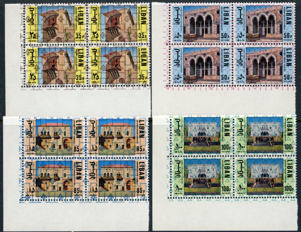 Lebanon: 1978 security overprinted on Lebanese Domestic Architecture issue of 1973 unmounted mint corner marginal block of four set. During the civil war so many stamps were looted from post offices that the authorities declared all previous invalid in 1977 and applied various patterns on remaining stock. Sg. 1243/1246 **