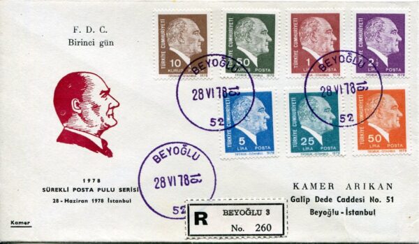 Türkiye: 28 June 1978 Atatürk definitive stamps on registered first day cover. Reverse same day cds.