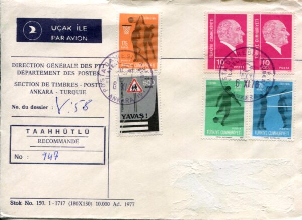 Turkey: 1978 Turkish Philately Service registered cover from Ankara franked with complete set of sports (basketball, football, volleyball) of 1974 and pair of 10l Ataturk definitive stamps. Addressee removed. Isfila 2736/2738, 2770