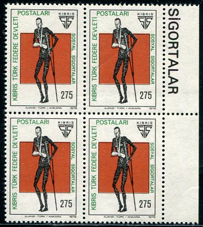 Turkish Cyprus: 1978 (17 April). Social Security 275m unmounted mint block of four with shifted red to top variety. **