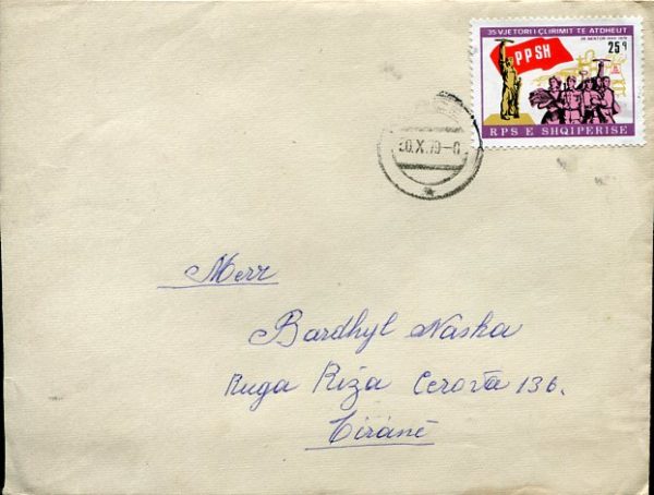 Albania: 1979 (30 October). Cover with its contents used inland franked with 25q Independence Anniversary commemorative stamp tied by Korce datestamp and next day Tirane arrival cds. Sc. 1933