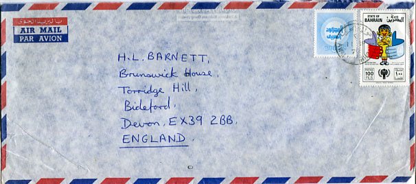 Bahrain: 1979 cover to England franked with 100f Year of the Child and 5f war tax stamps tied by Awali datestamps. Reverse no postal markings. Mi. 283, Sg. 257
