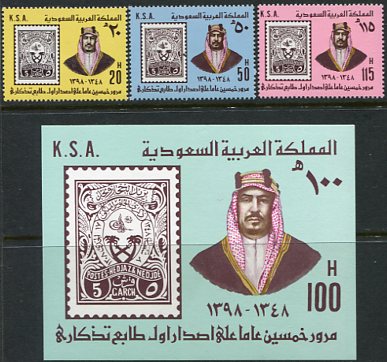 Saudi Arabia: 1979 (4 June). 50th Anniversary of First Commemorative stamp issue unmounted mint set and miniature sheet. Mi. 657/659 + Block 6, Sg. 1220/1222, MS1223