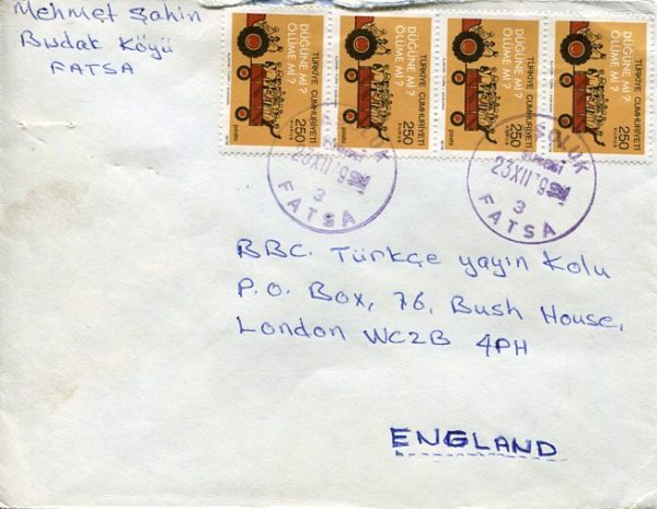 Turkey: 1979 cover to BBC franked with strip of four 250k Traffic Tractor definitive stamps tied by Taşoluk Fatsa datestamp. Isfila 2830