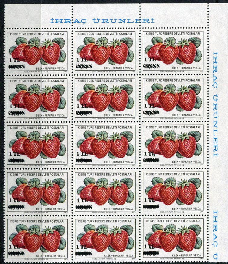 Turkish Cyprus: 1979 (4 June). Export Products 1l surcharged on 40m Strawberry design unmounted mint block of fifteen with weak surcharge to heavy surcharge variety. Scarce positional multiple. **