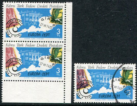 Turkish Cyprus: 1979 (20 August). Europa Cept 3l unmounted mint vertical pair with missing red-brown variety. Used stamp for comparison only. **