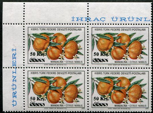 Turkish Cyprus: 1979 (4 June). Export Products 50kr surcharged on 25m Mandarin design unmounted mint block of four with end stem outside frame variety. **