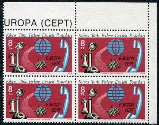 Turkish Cyprus: 1979 (20 August). Europa Cept 8l Telephone design unmounted mint block of four with black shift mostly on telephone base variety. **