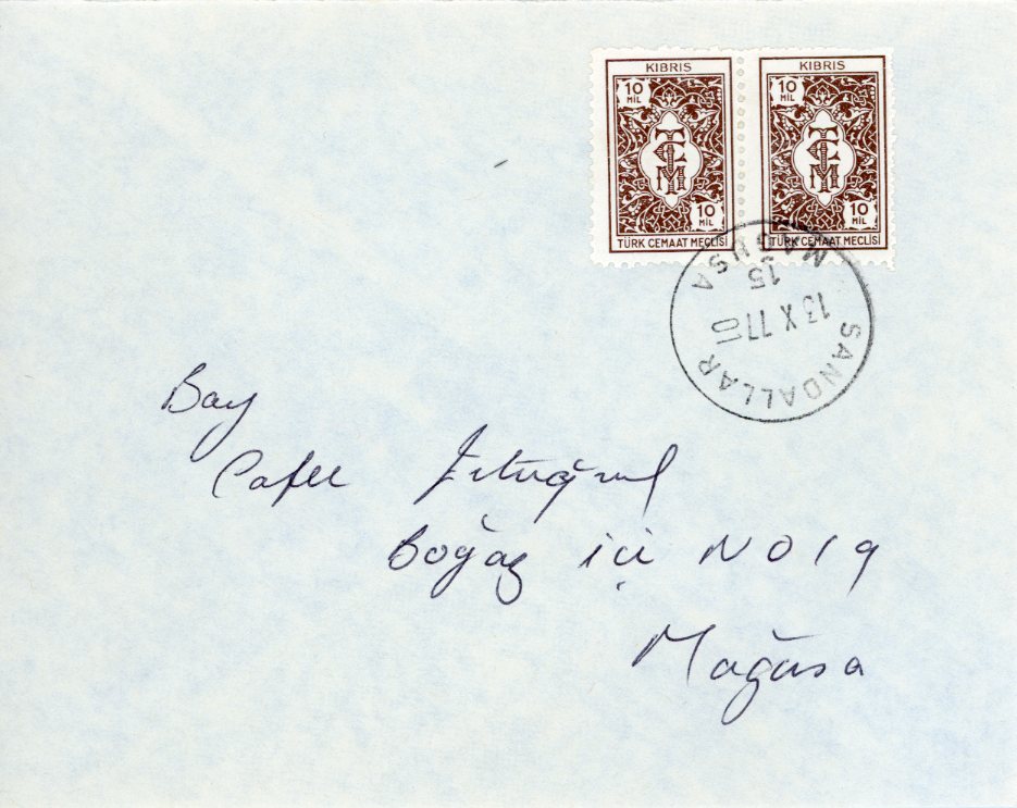 Turkish Cyprus: 1979 philatelic cover to Famagusta franked with pair of 10m. Turkish Community Assembly revenue stamps tied by Sandallar Magusa (Santalaris) datestamp.