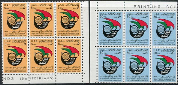 United Arab Emirates: 1979 (14 April). Gulf Postal Organization Conference unmounted mint block of six set. Mi. 98/99, Sg. 99/100