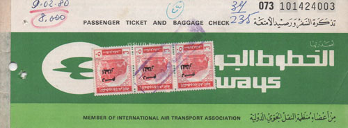 Iraq: 1980 Iraqi Airways Basra to Baghdad passenger ticket franked with strip of three 50f of 1969 Airport Departure overprinted tax stamps. Ross&Powell AP-5