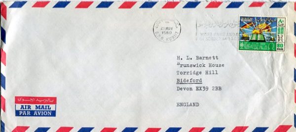 Kuwait: 1980 (23 November). Cover to England franked with 80f Arab Cultural Achievements stamp tied by GPO Kuwait meter franking. Reverse no postal markings. Mi. 825, Sg. 826
