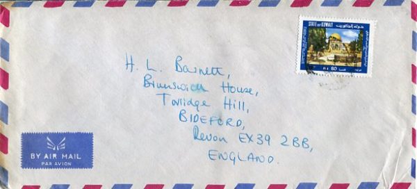 Kuwait: 1980s cover to England franked with 80f Solidarity with Palestinian People stamp. Reverse no postal markings. Mi. 878, Sg. 879