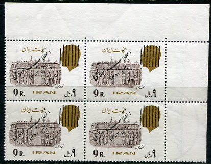 Iran: 1980 (11 February). Overprinted by the Islamic Republic obliterating Shah’s silhouette 9r unmounted mint corner marginal block of four. Key value of the set. Sg. 2104. **