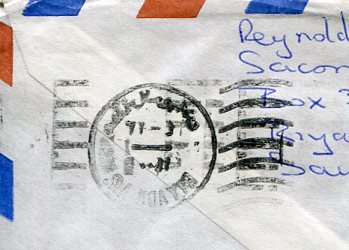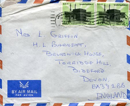 Saudi Arabia: 1980 cover to England franked with two 40h Holy Kaaba definitive stamps tied by Riyadh datestamps. Reverse repeat of the same cancel inverted. Mi. 636, Sg. 1144