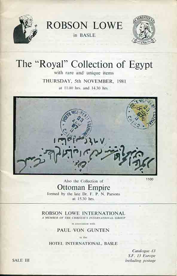 Egypt: 1981 (5 November). Robson Lowe auction catalogue of The Royal Collection of Egypt and Collection of Ottoman Empire formed by the late Dr. F.P.N. Parsons, 490 lots with b&w illustrations and a colour plate, unmarked clean copy. Sale 4652