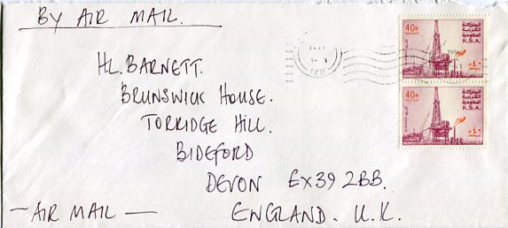 Saudi Arabia: 1981 cover to England franked with pair of 40h Al Khafi Oil Rig definitive stamps tied by TA’IF datestamps. Reverse no postal markings. Mi. 607I, Sg. 1174